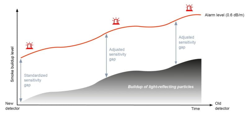 Dus hoe kunnen we het probleem omzeilen? Bestaat er zoiets als een betrouwbare kanaalrookmelder die niet elke twee weken vervangen hoeft te worden? Is er een soort functionaliteit die deze afwijkingen in gevoeligheid compenseert? Ja, en het wordt automatische gevoeligheidsaanpassing genoemd.