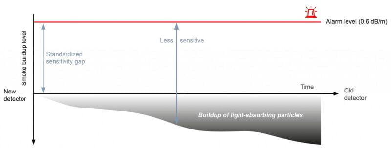 Als u bijvoorbeeld een detector heeft die langzaam gevuld wordt met lichtreflecterende deeltjes, is er minder rook nodig om een alarm af te laten gaan. Hoe meer vervuild de kamer wordt, hoe gevoeliger deze wordt en hoe dichter de detector bij het activeren van een alarm zal zijn. Iets dat op dit punt de moeite waard is om te onthouden, is dat niet alle verontreinigingen lichtreflecterend zijn. Hoewel minder gebruikelijk in commerciële en residentiële gebouwen, kunnen rookmelders daadwerkelijk verontreinigd raken met lichtabsorberende deeltjes.