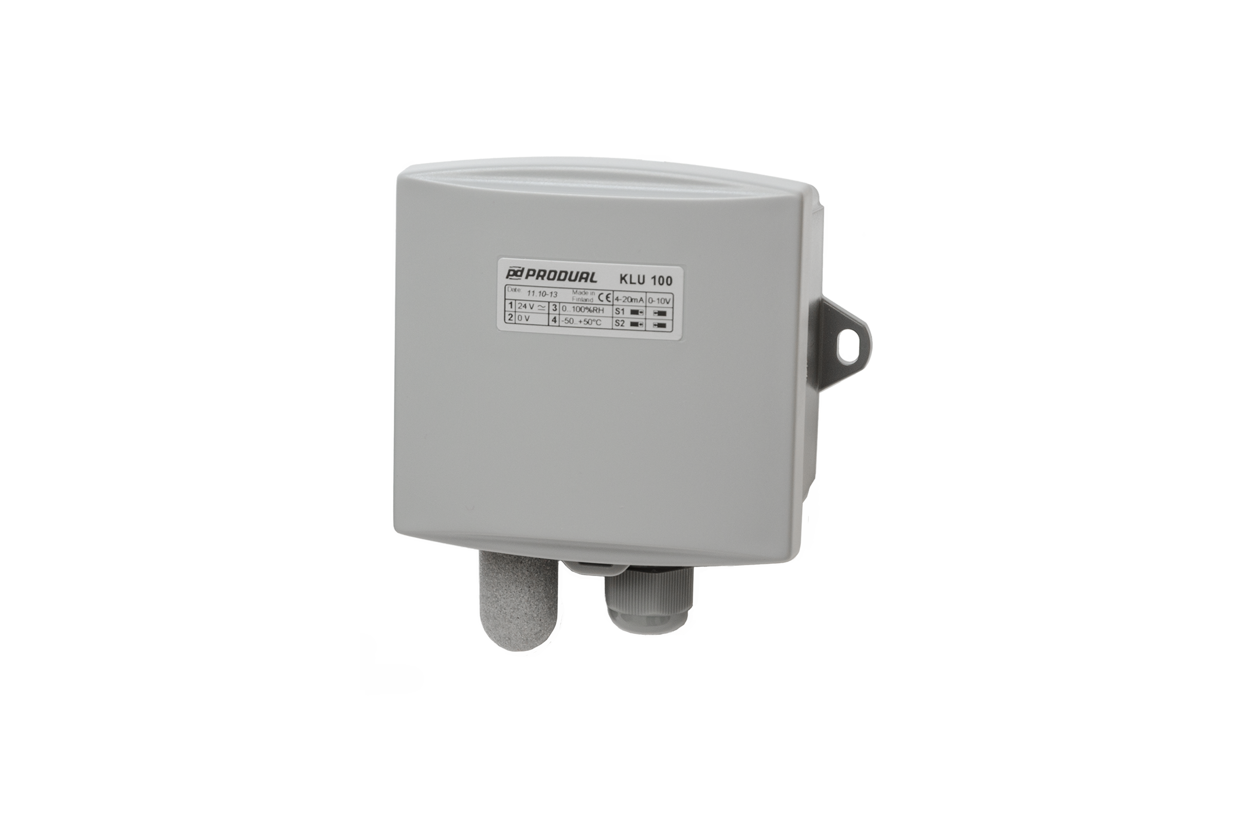 KLU 100 temperatuur- en vochtigheidstransmitters zijn ontworpen voor buitentoepassingen. De zender beschikt over een capacitieve sensor die de relatieve luchtvochtigheid detecteert en een NTC10 sensor voor de temperatuur meting. Een gesinterd plastic filter beschermt de sensorelementen.